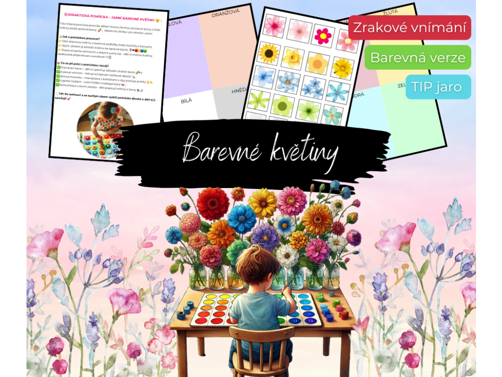 Hravá pomôcka pre deti na spoznávanie a triedenie farieb! Deti priraďujú kvety k príslušným farbám, čím si precvičujú zrakové vnímanie, jemnú motoriku a logické myslenie. Ideálne do materských škôl aj na domáce učenie. Možnosť laminovania a použitia suchého zipsu pre opakované použitie. 🎨✨